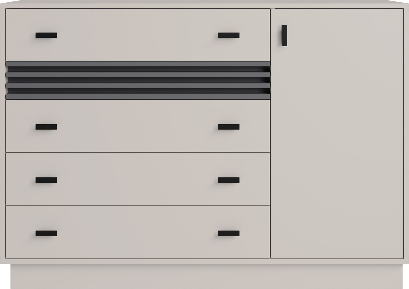 Komoda ALLMO AL17 v prevedení kašmír je moderným a praktickým doplnkom do obývacej izby, spálne alebo predsiene. Kombinácia drevodekoru s antracitom a lamelovým detailom vytvára štýlový a harmonický vzhľad, ktorý sa ľahko kombinuje s ostatným nábytkom. Komoda je jednodverová so štyrmi zásuvkami, ktoré poskytujú prehľadný úložný priestor na oblečenie, doplnky či dokumenty. Čierne kovové úchytky a ABS hrany dodávajú nábytku moderný vzhľad a zabezpečujú odolnosť a jednoduchú údržbu.