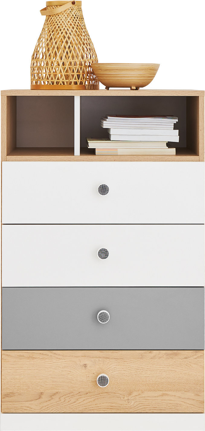 Komoda PIXEL PX10 v kombinácii farieb dub sušienkový/biela/sivá prináša moderný a útulný vzhľad vhodný do detskej izby pre chlapcov aj dievčatá. Svetlé odtiene doplnené o dekor dreva pôsobia harmonicky a jednoducho sa kombinujú s ostatným nábytkom. Komoda ponúka praktické úložné riešenie – štyri zásuvky a jedna polica, doplnené dvoma otvorenými policami na knihy, dekorácie alebo školské potreby. ABS hrany zabezpečujú dlhodobú odolnosť a bezpečné používanie.