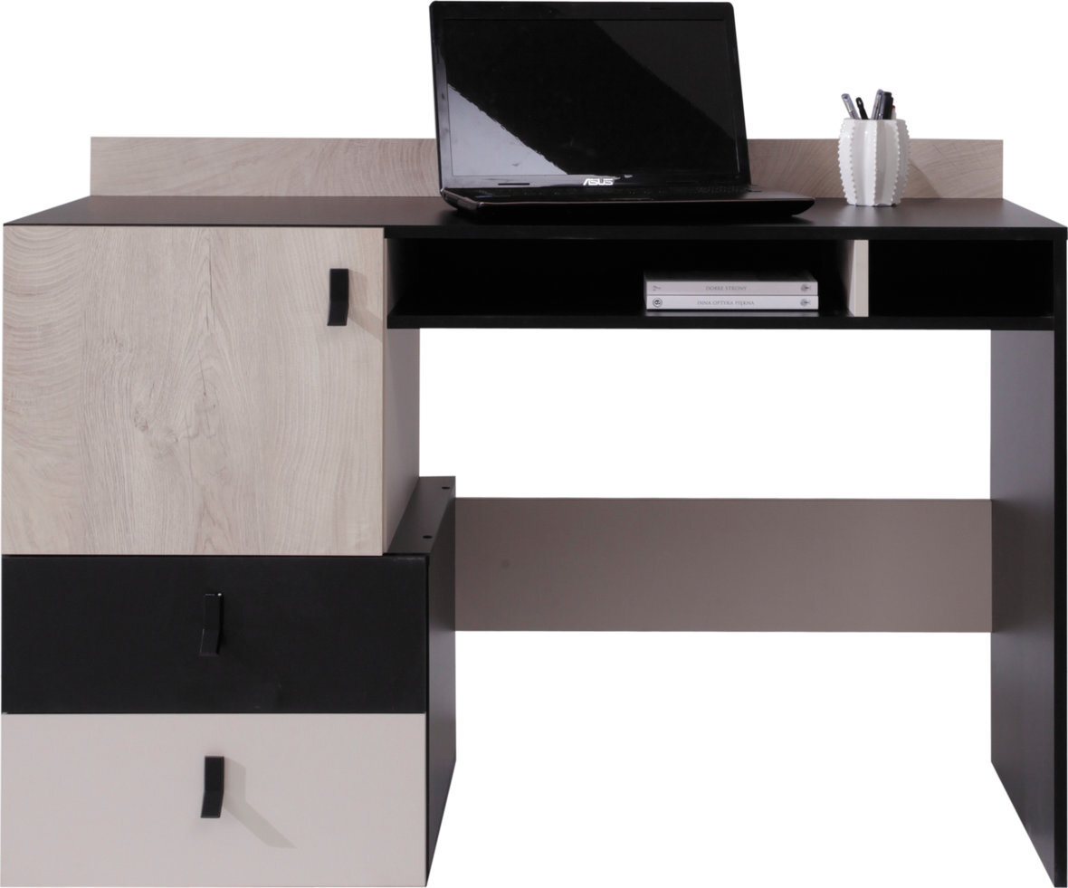 Písací stôl Planet PL09 je súčasťou moderného detského sektorového nábytku, ktorý umožňuje zariadiť detskú alebo študentskú izbu podľa individuálnych potrieb a vkusu. Jednotlivé prvky kolekcie možno medzi sebou kombinovať a vytvoriť tak funkčný a vizuálne jednotný interiér. Písací stôl Planet PL09 zaujme praktickým dizajnom a dôrazom na funkčnosť pracovného priestoru. Pracovná doska je zo zadnej strany vybavená nízkou zábranou, ktorá zabraňuje pádu predmetov, a zároveň poskytuje dostatok miesta na písanie, štúdium alebo prácu na počítači. Stôl disponuje otvoreným odkladacím priestorom pod pracovnou doskou, uzatvárateľnou skrinkou s dvierkami a dvomi zásuvkami, ktoré umožňujú prehľadné usporiadanie školských potrieb a doplnkov. Moderné farebné prevedenie čierna/dub/béžová pôsobí sviežo a nadčasovo.