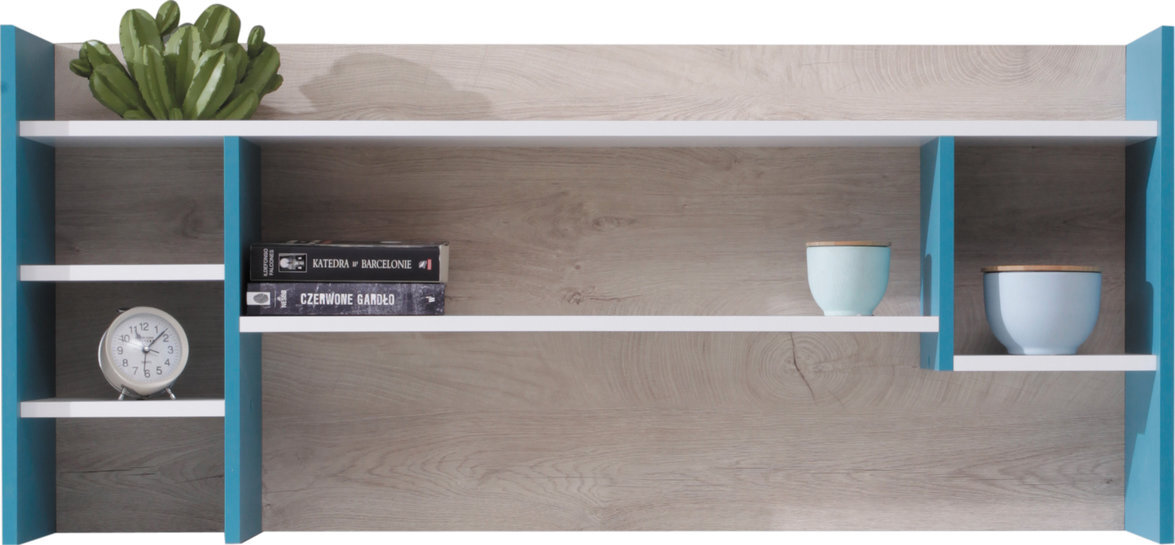 Polica Planet PL11 je súčasťou moderného detského sektorového nábytku, ktorý umožňuje zariadiť detskú alebo študentskú izbu podľa individuálnych potrieb a vkusu. Jednotlivé prvky kolekcie možno medzi sebou kombinovať a vytvoriť tak funkčný a vizuálne jednotný interiér. Polica na stenu Planet PL11 zaujme praktickým dizajnom a variabilným využitím. Disponuje otvorenými policami, ktoré sú ideálne na uloženie kníh, školských potrieb, hier alebo dekorácií. Výhodou je možnosť umiestnenia nielen na stenu, ale aj na písací stôl, vďaka čomu môžu mať školáci všetky dôležité veci vždy poruke. Moderné farebné prevedenie biela/dub/morská pôsobí sviežo a nadčasovo.