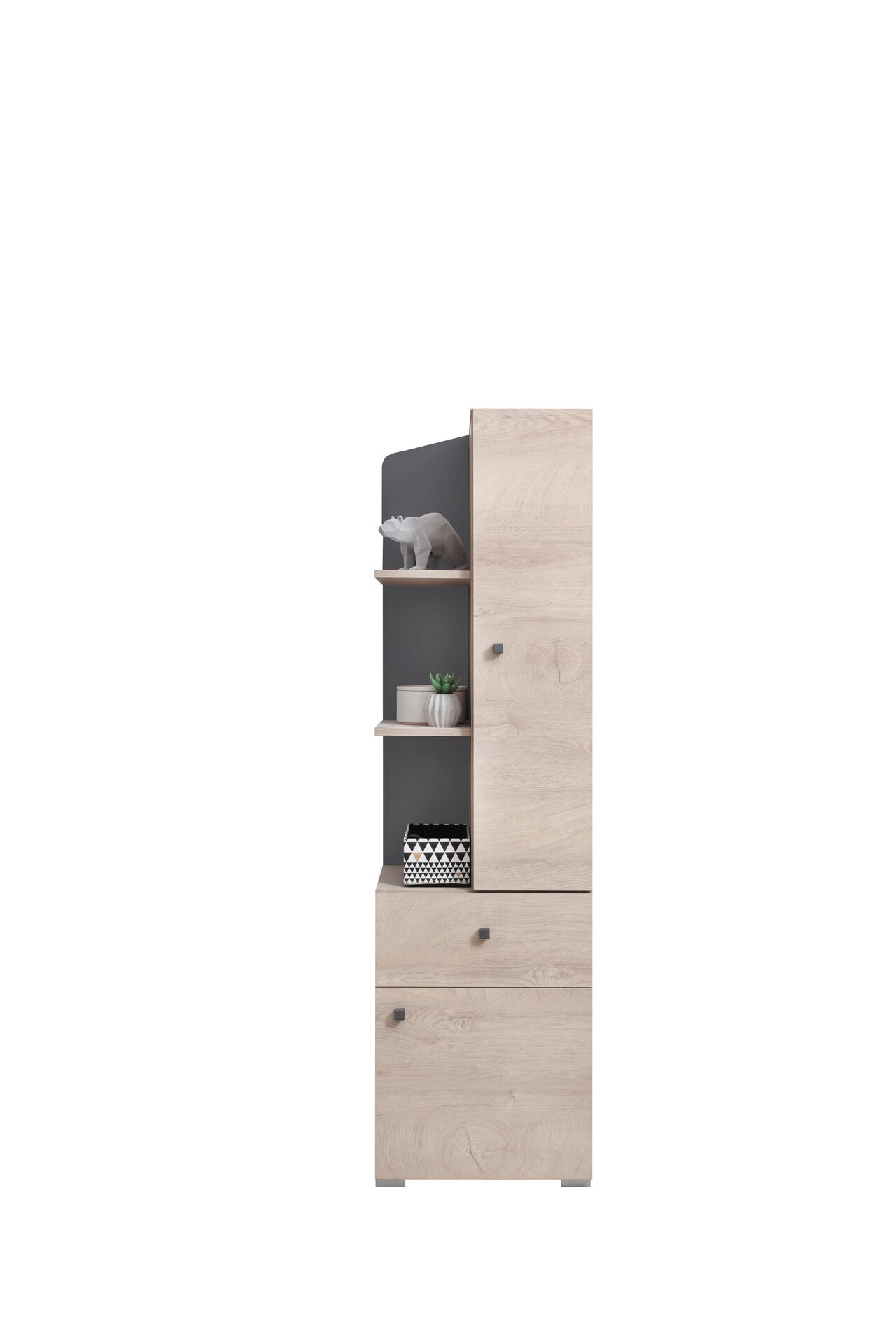 Skrinka DELTA DL07 v prevedení dub/antracit je praktickým a štýlovým doplnkom do detskej izby. Kombinácia drevodekoru s tmavým antracitom pôsobí moderne a harmonicky a ľahko sa kombinuje s ostatným nábytkom a farebnými doplnkami. Skrinka ponúka prehľadne členený vnútorný priestor s dvierkami, zásuvkou a policami, čo umožňuje pohodlné uloženie oblečenia, školských potrieb alebo drobností. Je vhodná pre dievčatá aj chlapcov a doplní každý sektorový segment kolekcie DELTA.