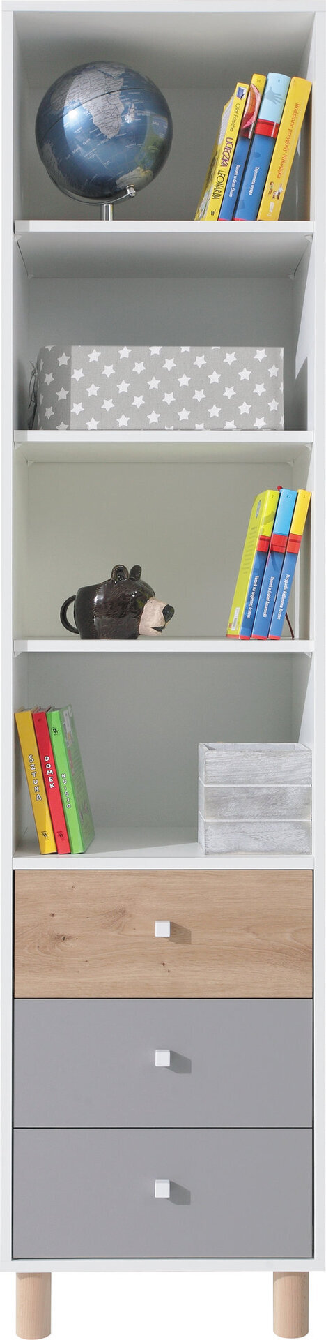 Regál Faro FR07 je súčasťou obľúbenej študentskej sektorovej kolekcie, ktorá umožňuje zariadiť detskú alebo študentskú izbu podľa vlastných predstáv. Jednotlivé prvky kolekcie možno medzi sebou kombinovať a vytvoriť tak funkčný a vizuálne jednotný interiér. Regál Faro zaujme moderným dizajnom a praktickým usporiadaním úložného priestoru. Disponuje štyrmi otvorenými policami, ktoré sú ideálne na knihy, zošity alebo dekorácie, a tromi zásuvkami v spodnej časti na uloženie drobností a doplnkov. Vďaka tomuto rozloženiu ponúka dostatok miesta na prehľadné usporiadanie vecí a pomáha udržiavať poriadok v izbe. Moderné farebné prevedenie biela/dub artisan/šedá pôsobí sviežo a nadčasovo.