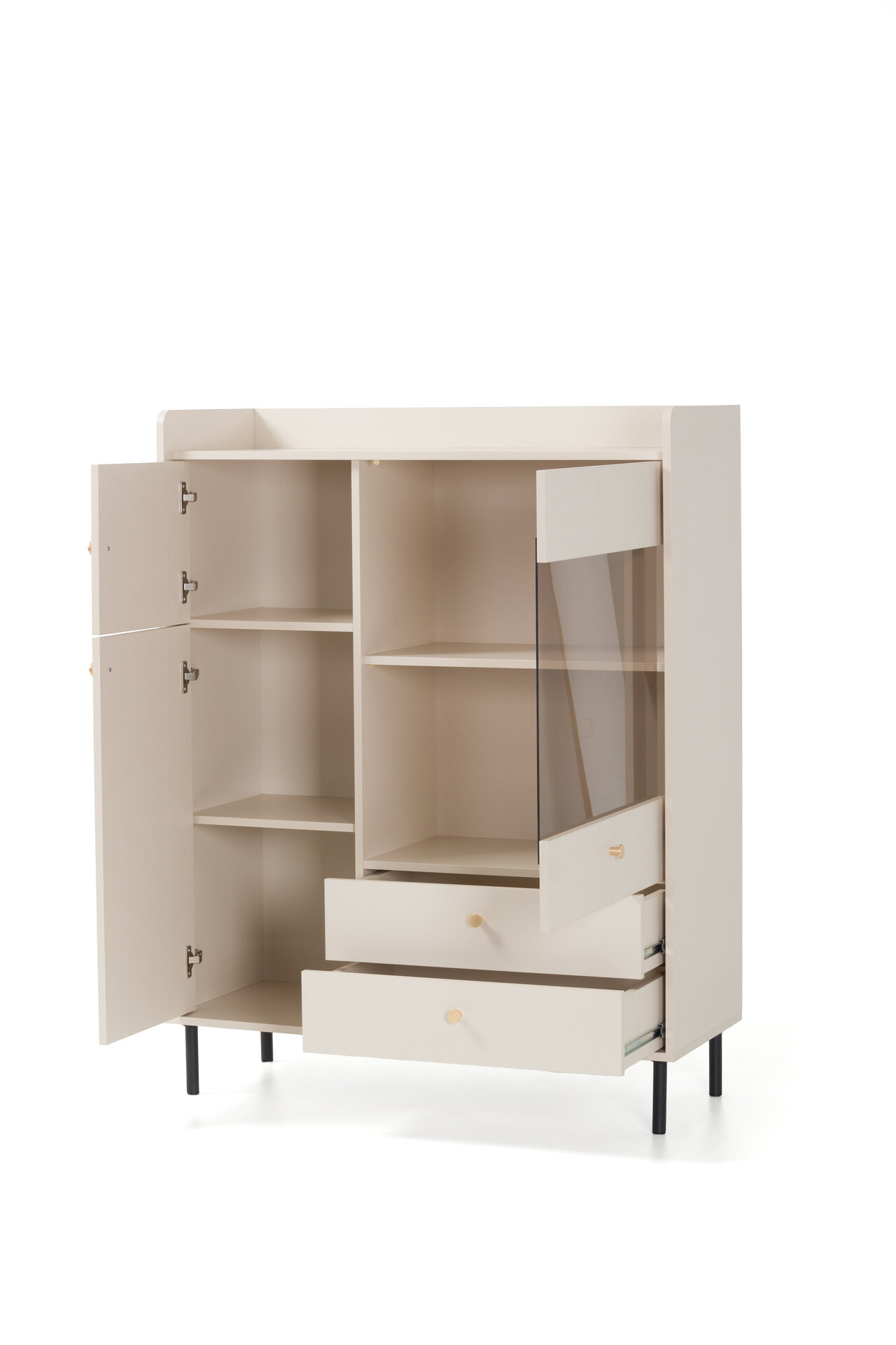 Regál GRANDE GR02 z kolekcie GRANDE kombinuje štýlový dizajn s praktickosťou. Vyvýšené okraje a jemne zaoblené hrany chránia povrch pred pádom predmetov a dodávajú nábytku elegantný vzhľad. Priestranné zásuvky a skrinky poskytujú dostatok úložného priestoru a zlaté úchytky dotvárajú luxusný detail. ABS hrany zaručujú odolnosť a jednoduchú údržbu, zatiaľ čo pevná konštrukcia z laminovanej dosky zabezpečuje stabilitu a dlhú životnosť. Povrch nábytku je nenáročný na údržbu – stačí pretrieť mäkkou, mierne navlhčenou handričkou.