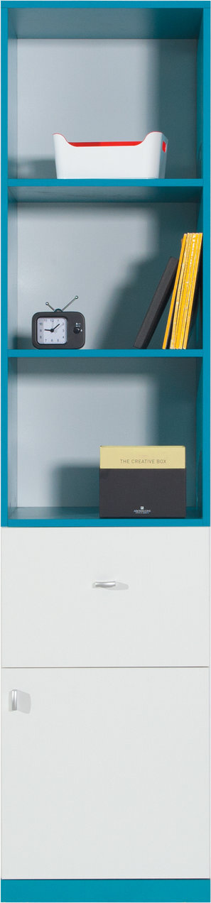Regál Mobi MB05 je súčasťou moderného detského sektorového nábytku, ktorý umožňuje zariadiť izbu podľa individuálnych potrieb a vkusu. Jednotlivé prvky kolekcie možno medzi sebou kombinovať a vytvoriť tak funkčný a vizuálne jednotný interiér. Regál Mobi MB05 zaujme štýlovým dizajnom a praktickým riešením úložného priestoru. Disponuje tromi otvorenými policami, zásuvkou a uzatvárateľnou skrinkou s dvierkami, ktoré poskytujú dostatok miesta na uloženie kníh, hračiek, školských potrieb či doplnkov. Vďaka premyslenému rozloženiu umožňuje prehľadné usporiadanie vecí a pomáha udržiavať poriadok v izbe. Moderné farebné prevedenie biela/tyrkys pôsobí sviežo a hravo.
