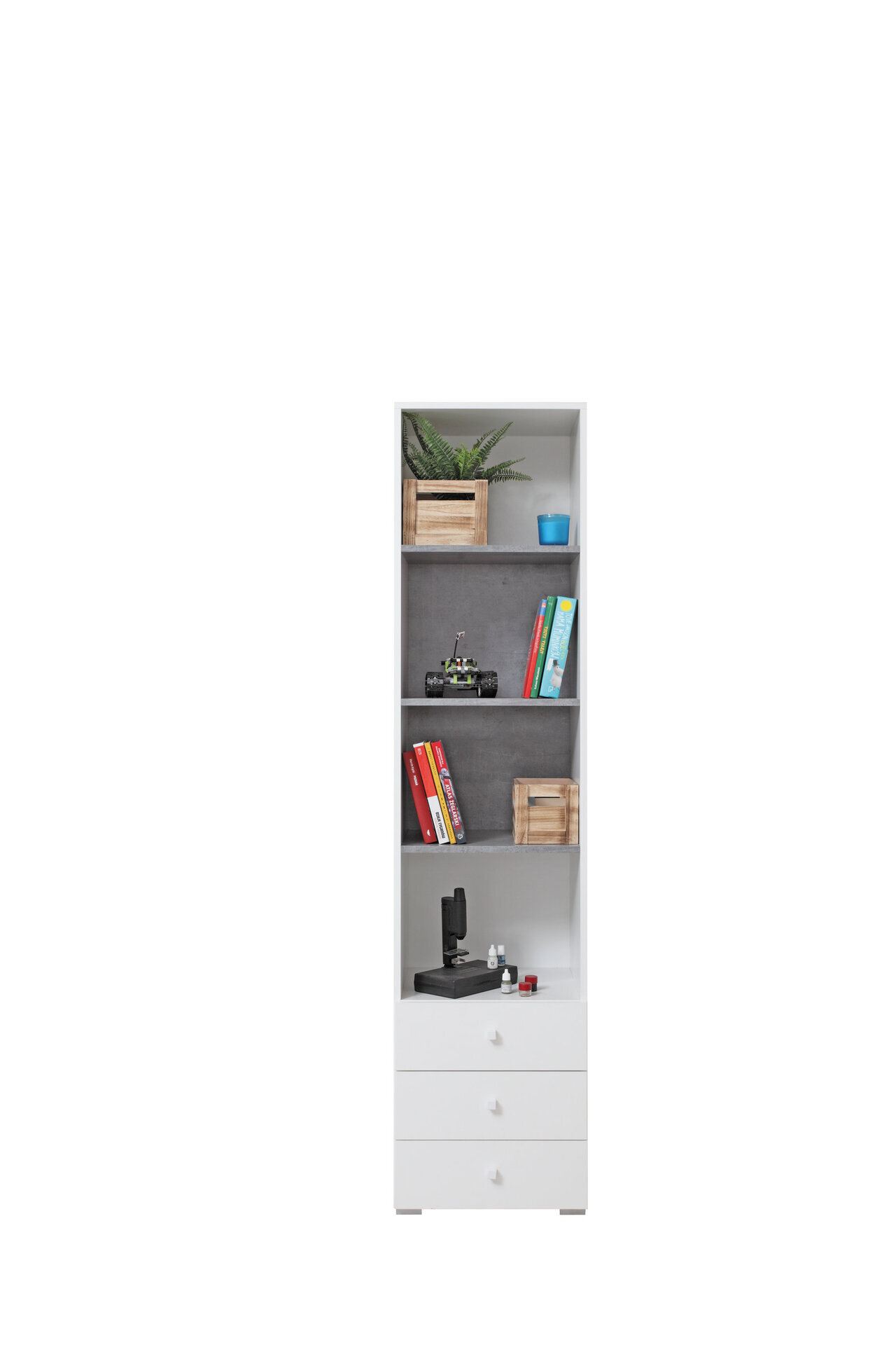 Regál SIGMA SI7 je praktickým doplnkom do detskej alebo študentskej izby, ktorý zaujme moderným a čistým dizajnom. Kombinácia betónového a bieleho dekoru pôsobí nadčasovo a jednoducho sa kombinuje s ostatným nábytkom v interiéri. Regál ponúka dostatok úložného priestoru v podobe otvorených políc a troch zásuviek, ktoré umožňujú prehľadné uloženie kníh, doplnkov aj osobných vecí. Otvorená časť je ideálna na vystavenie dekorácií, zatiaľ čo zásuvky pomáhajú udržať poriadok.