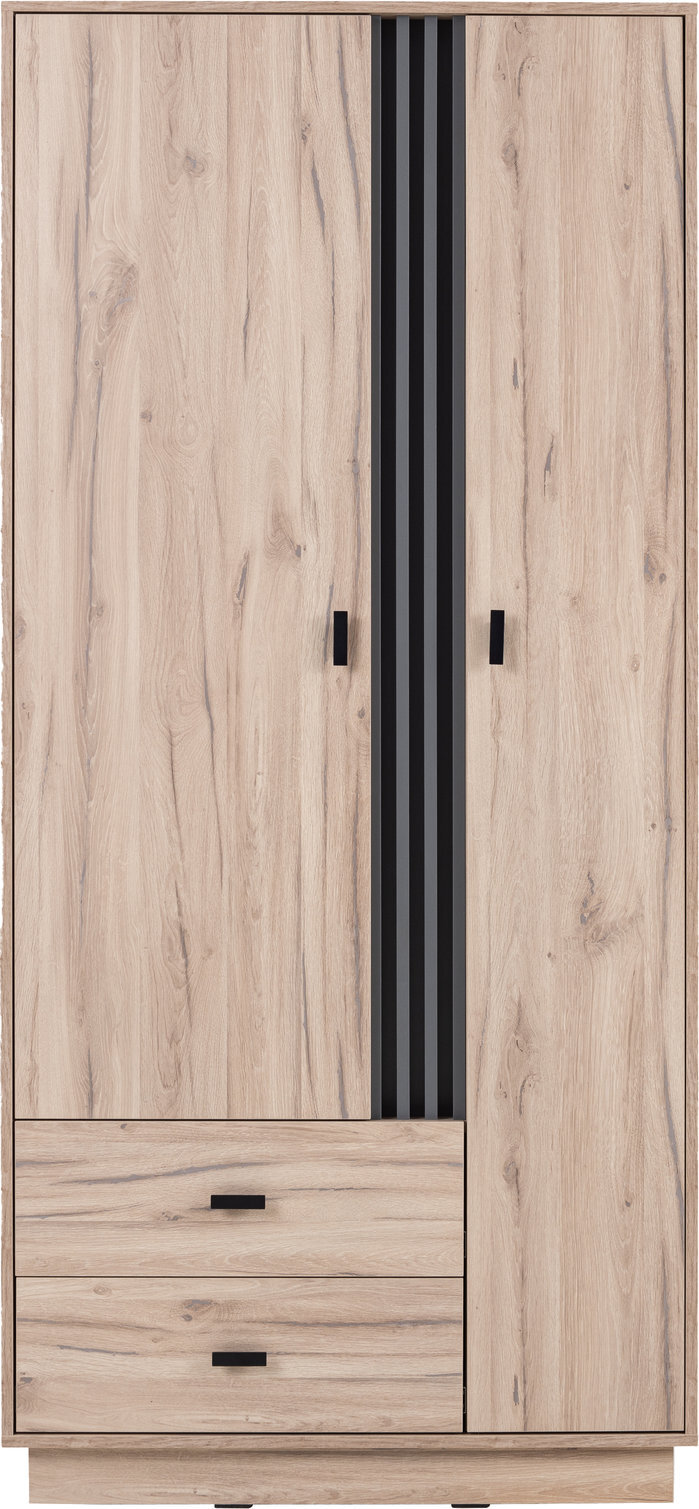Moderná šatníková skriňa predstavuje praktické a zároveň štýlové riešenie úložného priestoru do spálne, detskej aj študentskej izby. Vyznačuje sa čistými líniami a výrazným vertikálnym antracitovým prvkom, ktorý jej dodáva osobitý a nadčasový charakter.Vnútorný priestor je prehľadne rozdelený na vešiakovú a policovú časť. Jedna strana je vybavená šatníkovou tyčou na zavesenie oblečenia a spodným úložným priestorom, druhá ponúka viacero políc na uloženie poskladaných vecí či doplnkov. Spodnú časť dopĺňajú dve priestranné zásuvky, ktoré poskytujú ďalší praktický úložný priestor. Tmavé kovové úchytky zabezpečujú pohodlné otváranie a zároveň zvýrazňujú moderný dizajn nábytku.Skriňa je dostupná v dvoch farebných kombináciách: dub estana + antracit alebo cashmere + antracit.