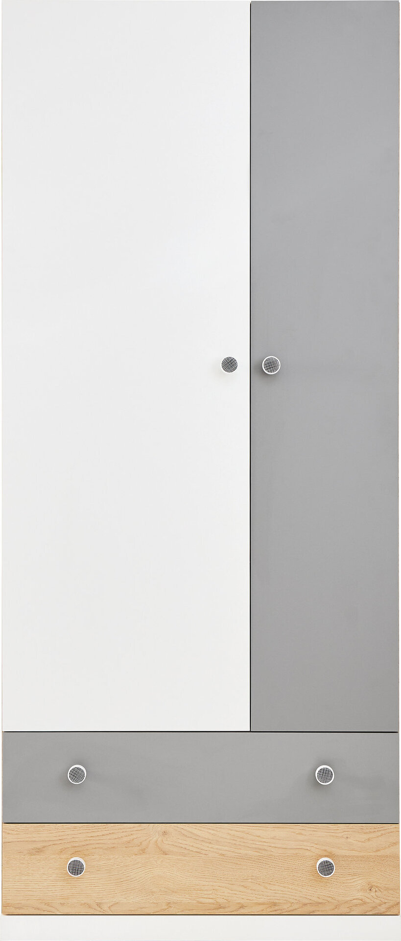 Dvojdverová šatníková skriňa Pixel 03 je navrhnutá pre detské a študentské izby, kde je potrebné spojiť praktickosť s moderným vzhľadom. Funkčné vnútorné usporiadanie pomáha udržať poriadok a prehľadne zorganizovať oblečenie aj doplnky.Skriňa ponúka päť priestranných políc a vešiakovú tyč na zavesenie košieľ, mikín či búnd. Spodnú časť dopĺňajú dve zásuvky s modernými úchytkami, ktoré poskytujú ďalší úložný priestor na menšie kusy oblečenia alebo doplnky. Farebné prevedenie biela / sivá / prírodná pôsobí sviežo a jednoducho sa kombinuje s ostatným nábytkom v izbe.Model Pixel 03 je ideálnou voľbou pre deti aj tínedžerov, ktorí potrebujú kompaktnú, no praktickú skriňu s dostatočným úložným priestorom.